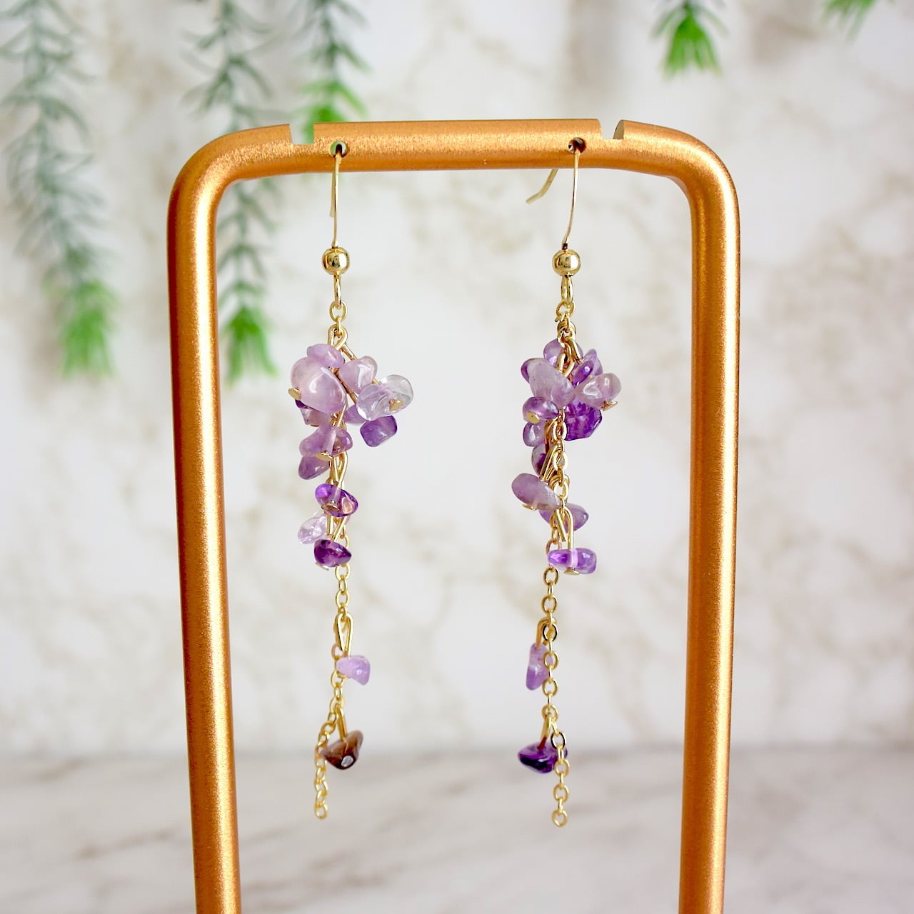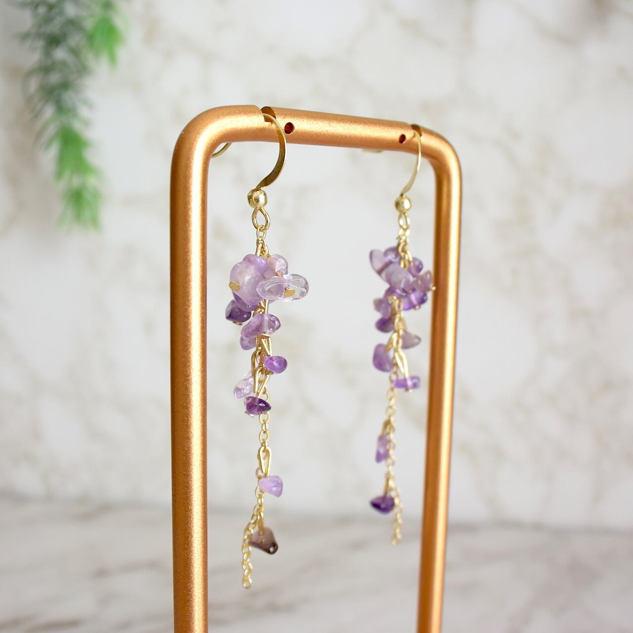 藤の花をイメージして、アメジストのさざれ石をふんだんに使った、ゆらゆらと揺れる優美なピアスです。