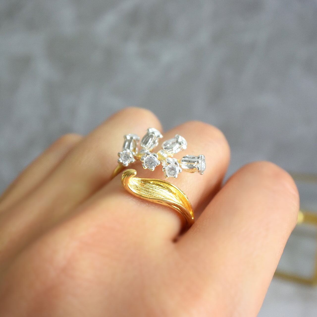 可憐なすずらんの花をシルバーとゴールドのコンビカラーで精巧に再現した、存在感がありながらも上品なリングです。