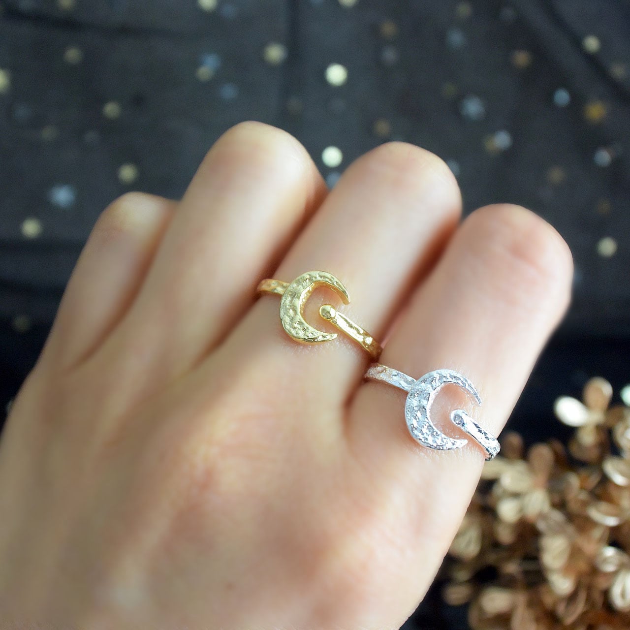 三日月をかたどった、味のある槌目が印象的なスターリングシルバーSV925製のリングです。