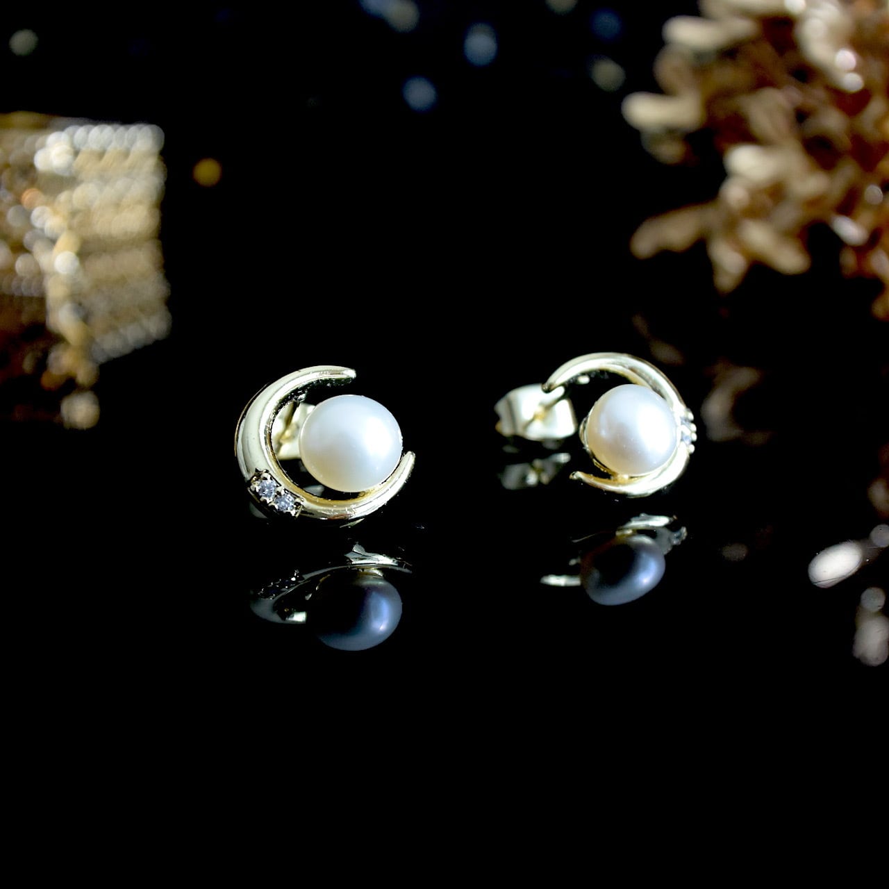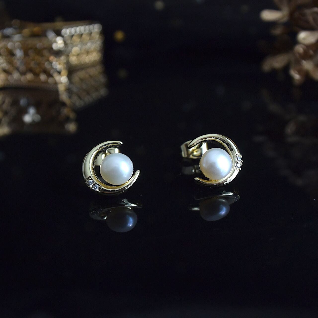 小さなジルコニアがポイントになったゴールドの三日月に、艷やかな淡水パールを月のしずくのように付けたピアスです。