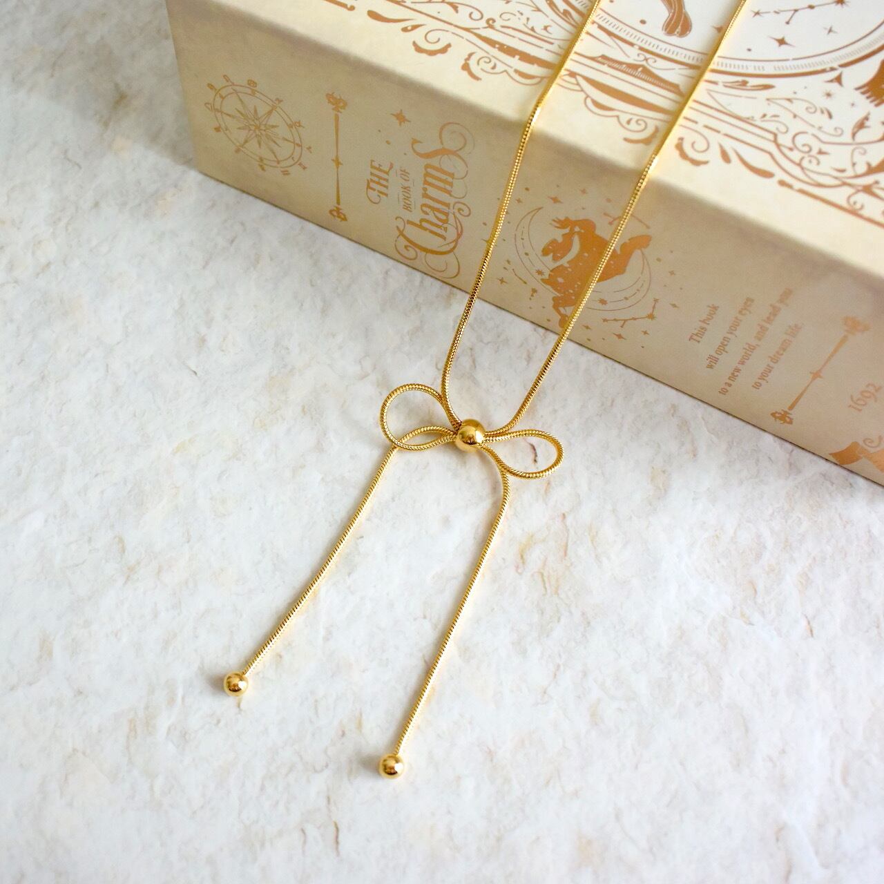 【Aimer le soi】蝶々結びリボンのスネークチェーンネックレス ステンレス製 ゴールド