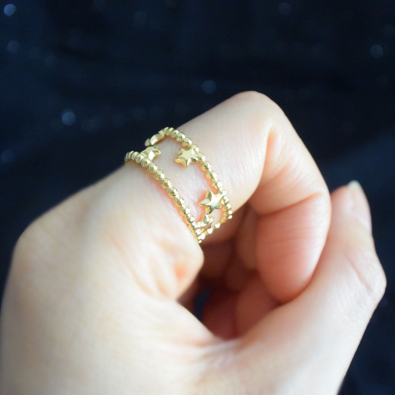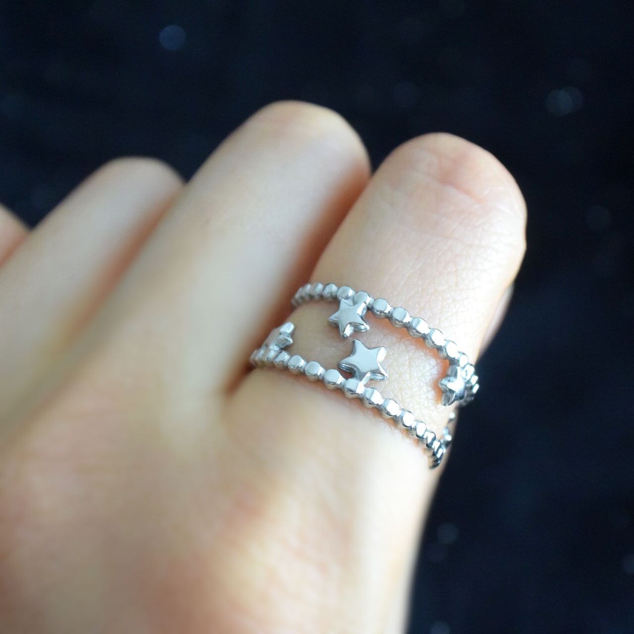 小さな星がランダムに散りばめられた、天の川のようなデザインのリング。