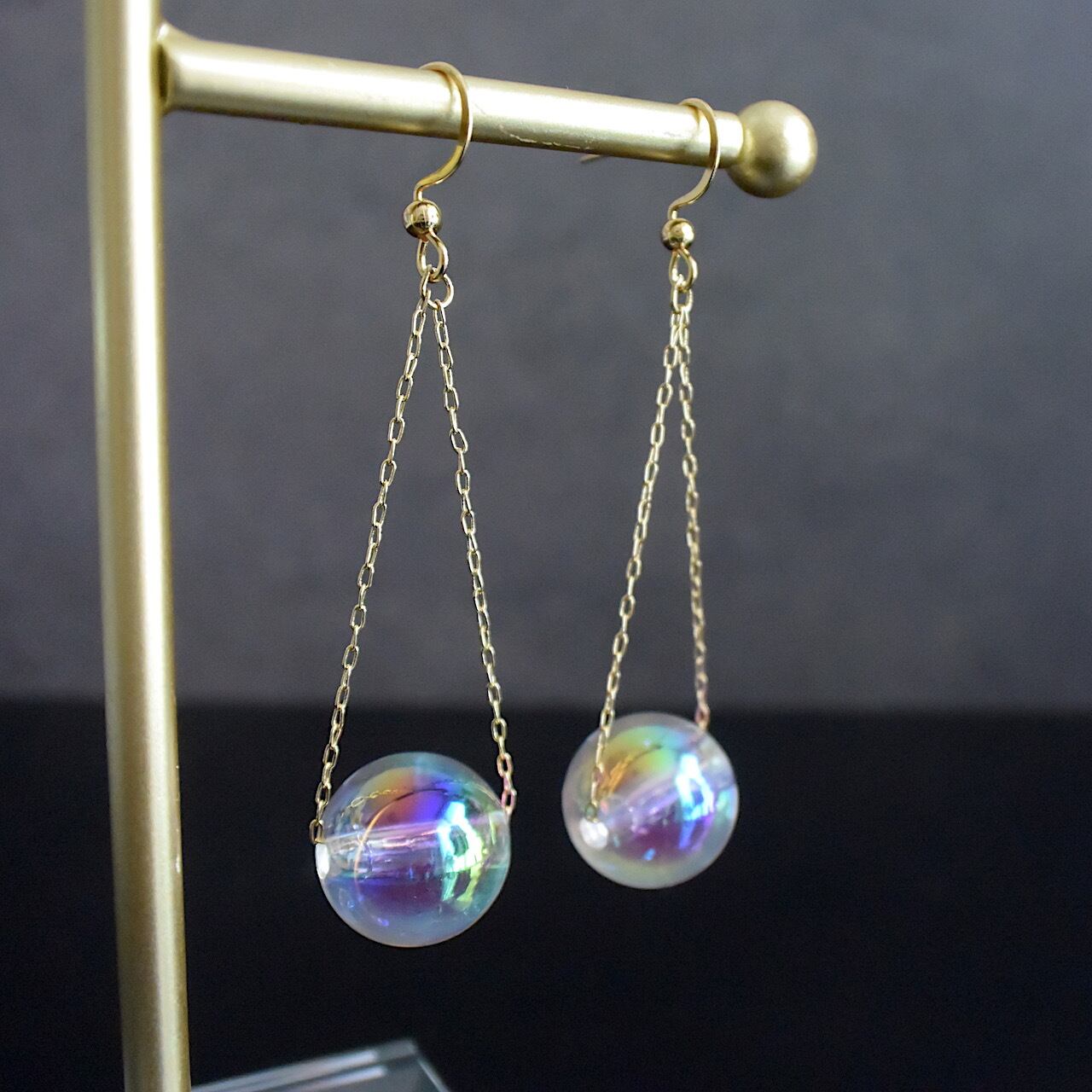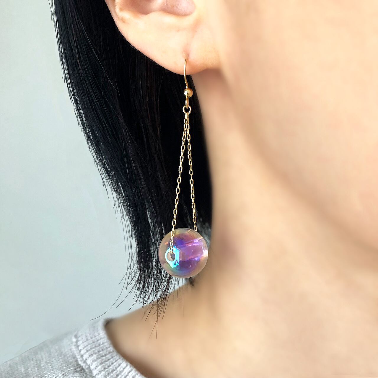 シャボン玉のような、オーロラカラーの大きなビーズを繊細なチェーンに通した、シンプルで上品なピアスを作りました。