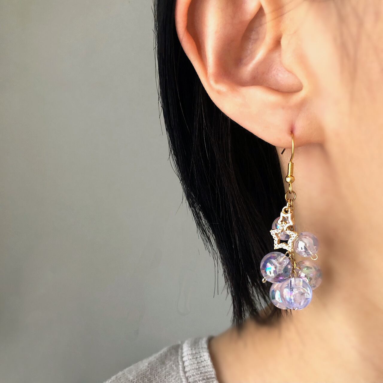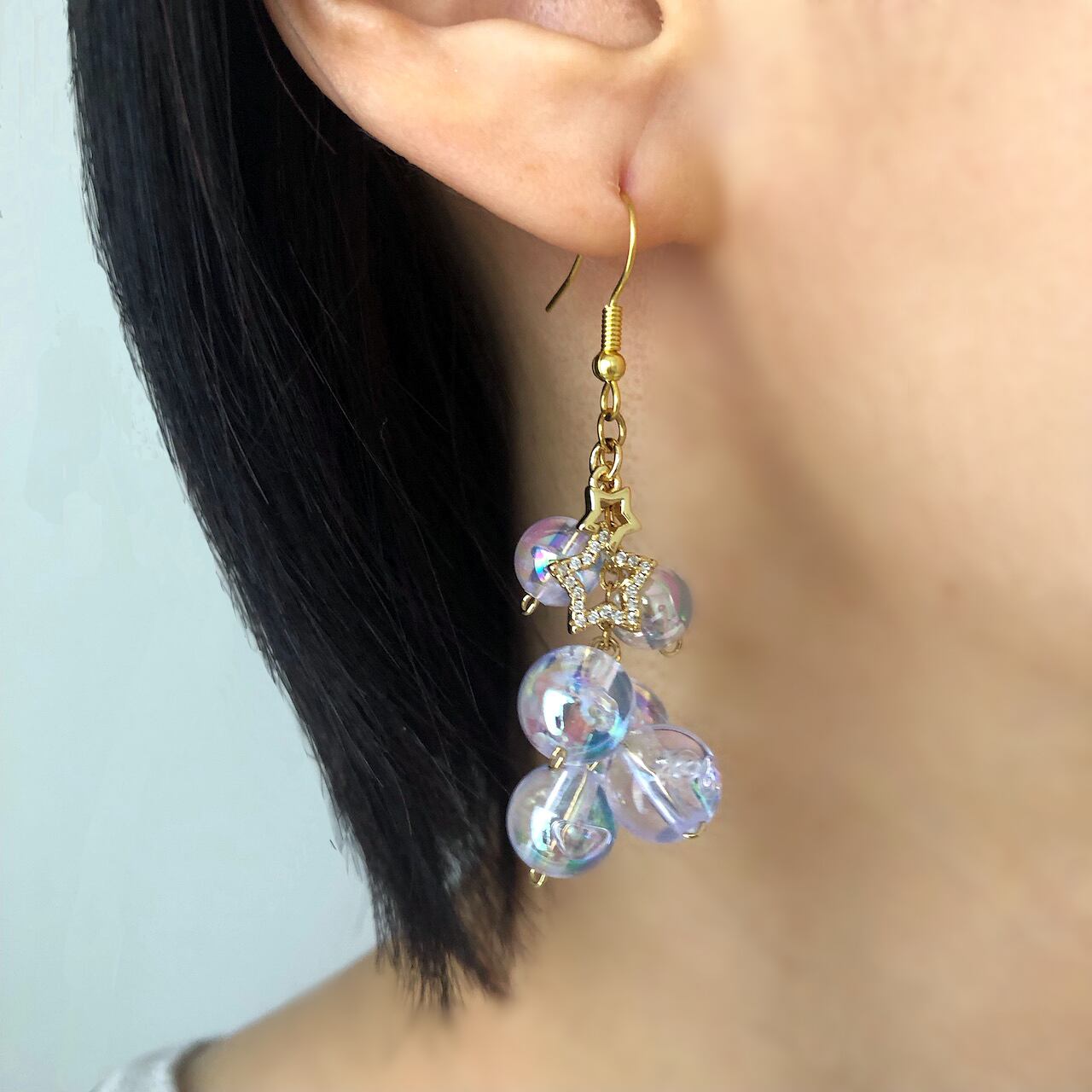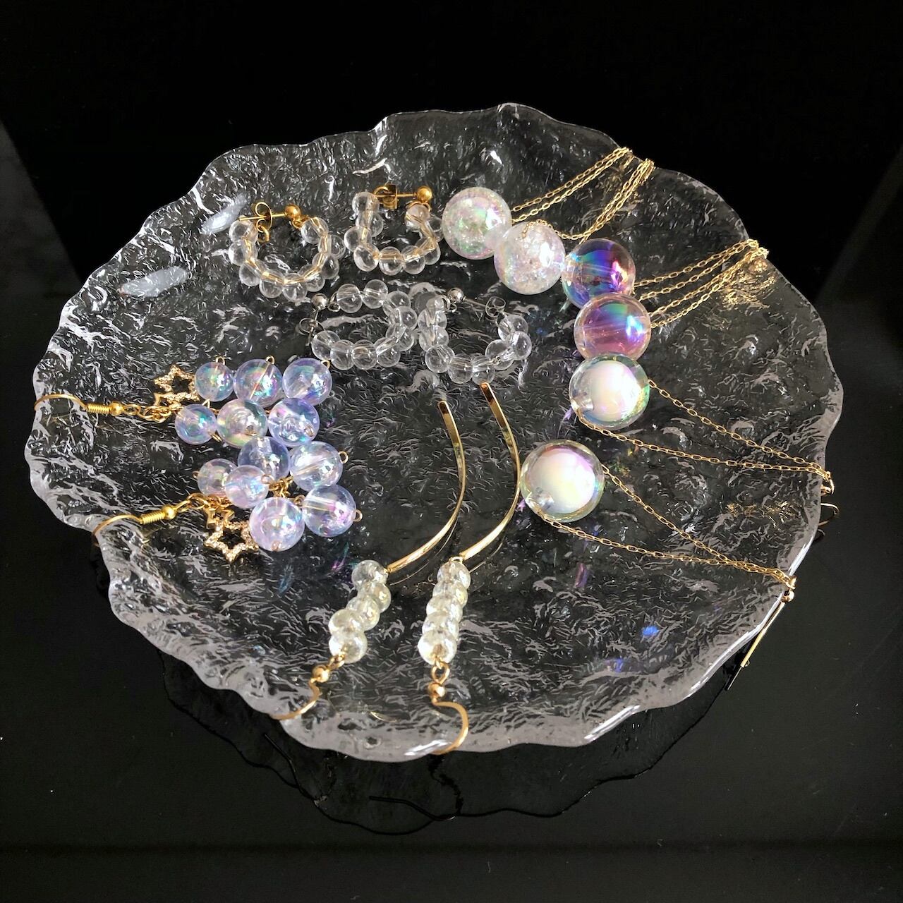 シャボン玉のような大小のオーロラカラーのビーズをふんだんに、じゃらじゃらと付けた楽しいピアスです。