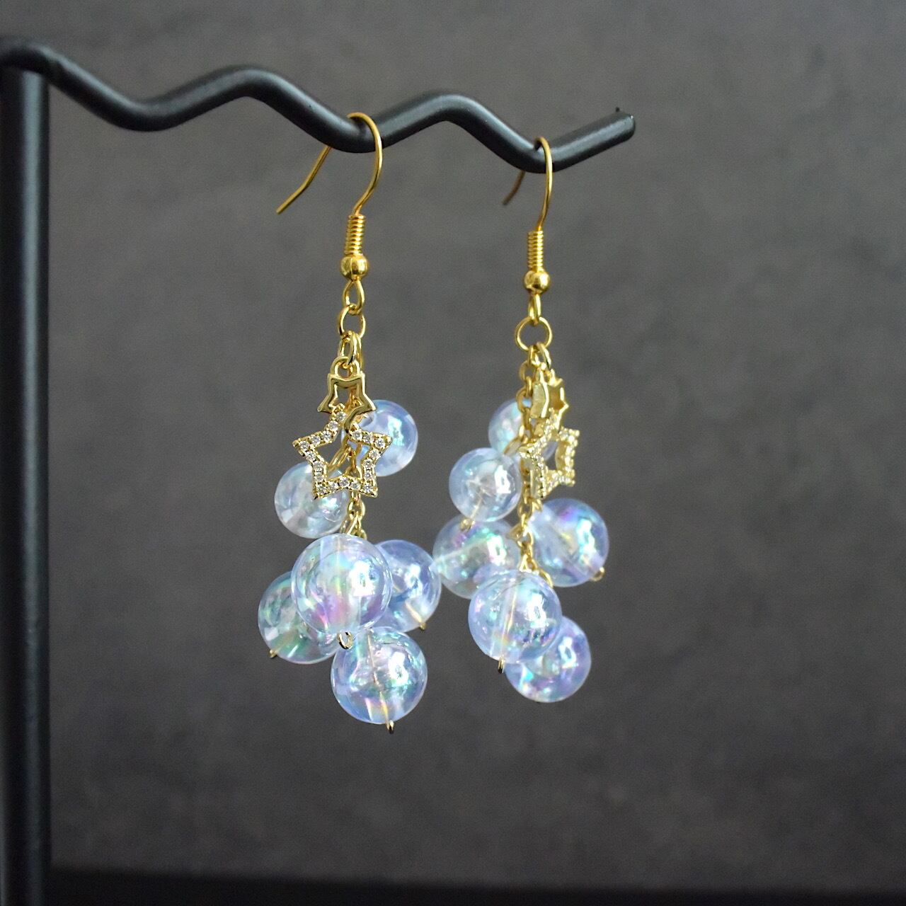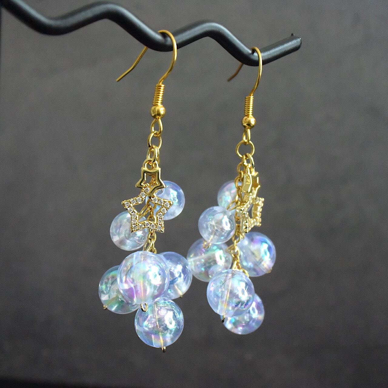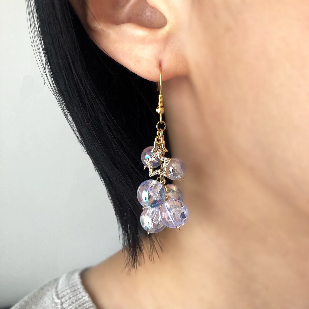 シャボン玉のような大小のオーロラカラーのビーズをふんだんに、じゃらじゃらと付けた楽しいピアスです。