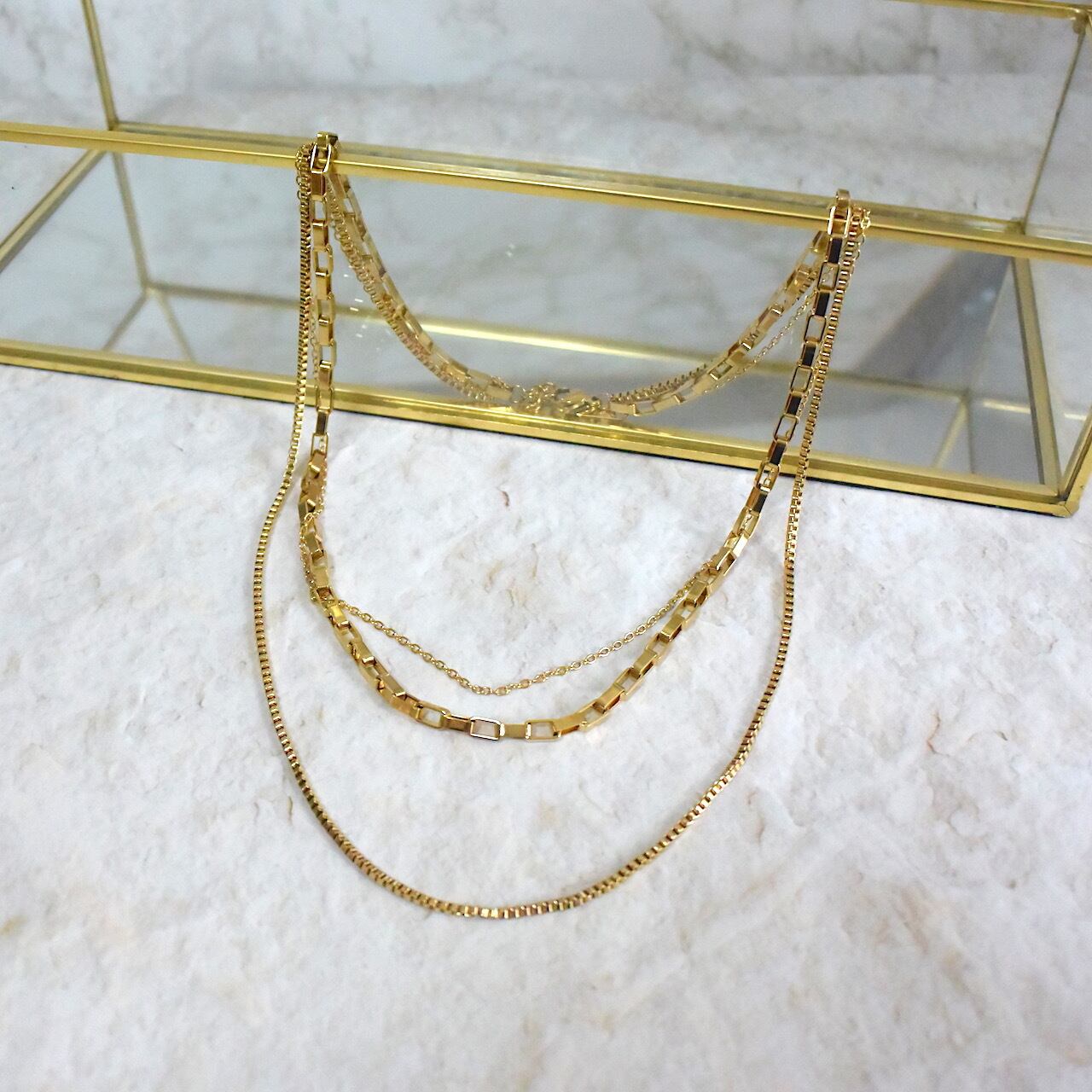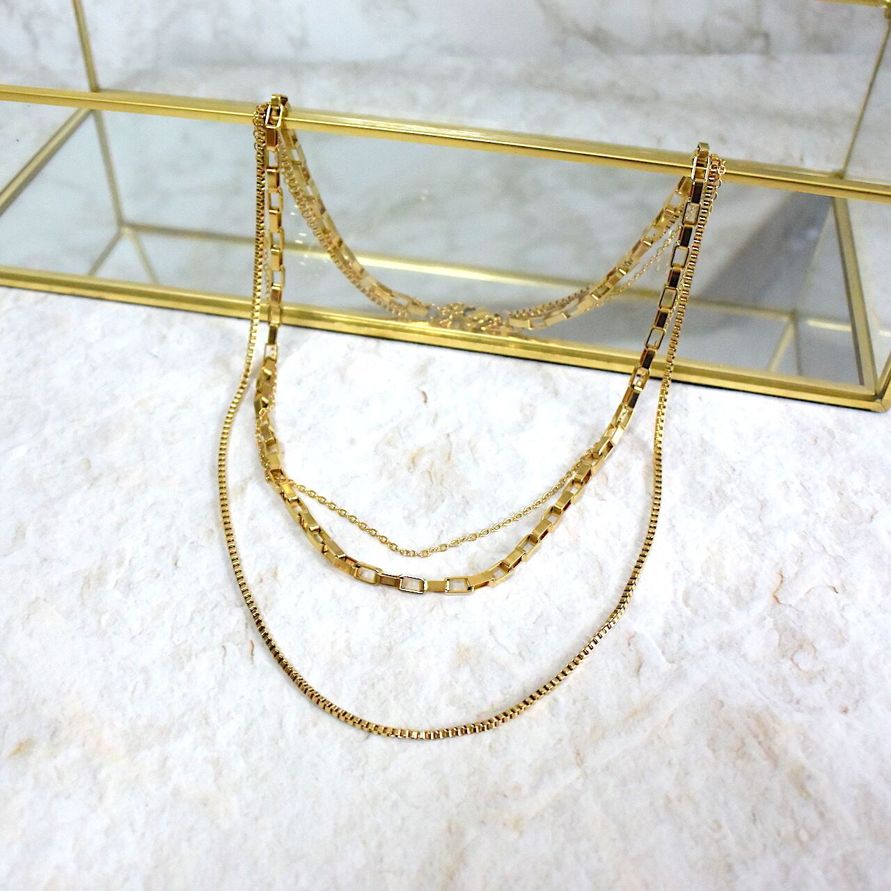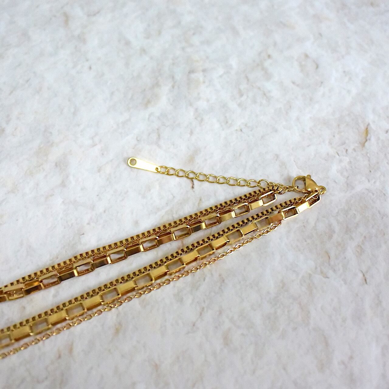 3連ボックスチェーンのレイヤードネックレス ステンレス ゴールド