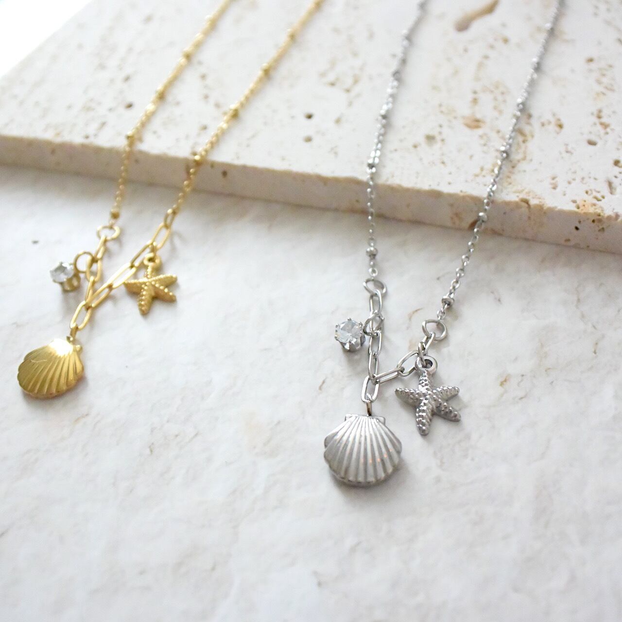 マリンテイスト シェルとヒトデの海モチーフネックレス ステンレスチェーン ゴールド/シルバー