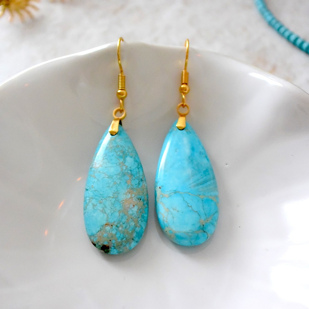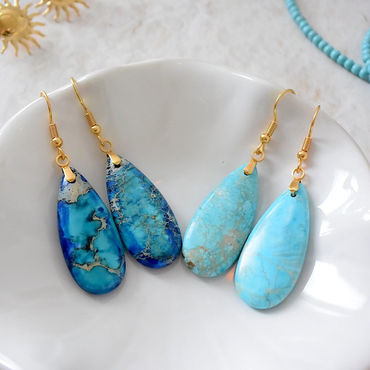 ブルーインペリアルジャスパーのエスニック風ドロップピアス ステンレス ゴールド