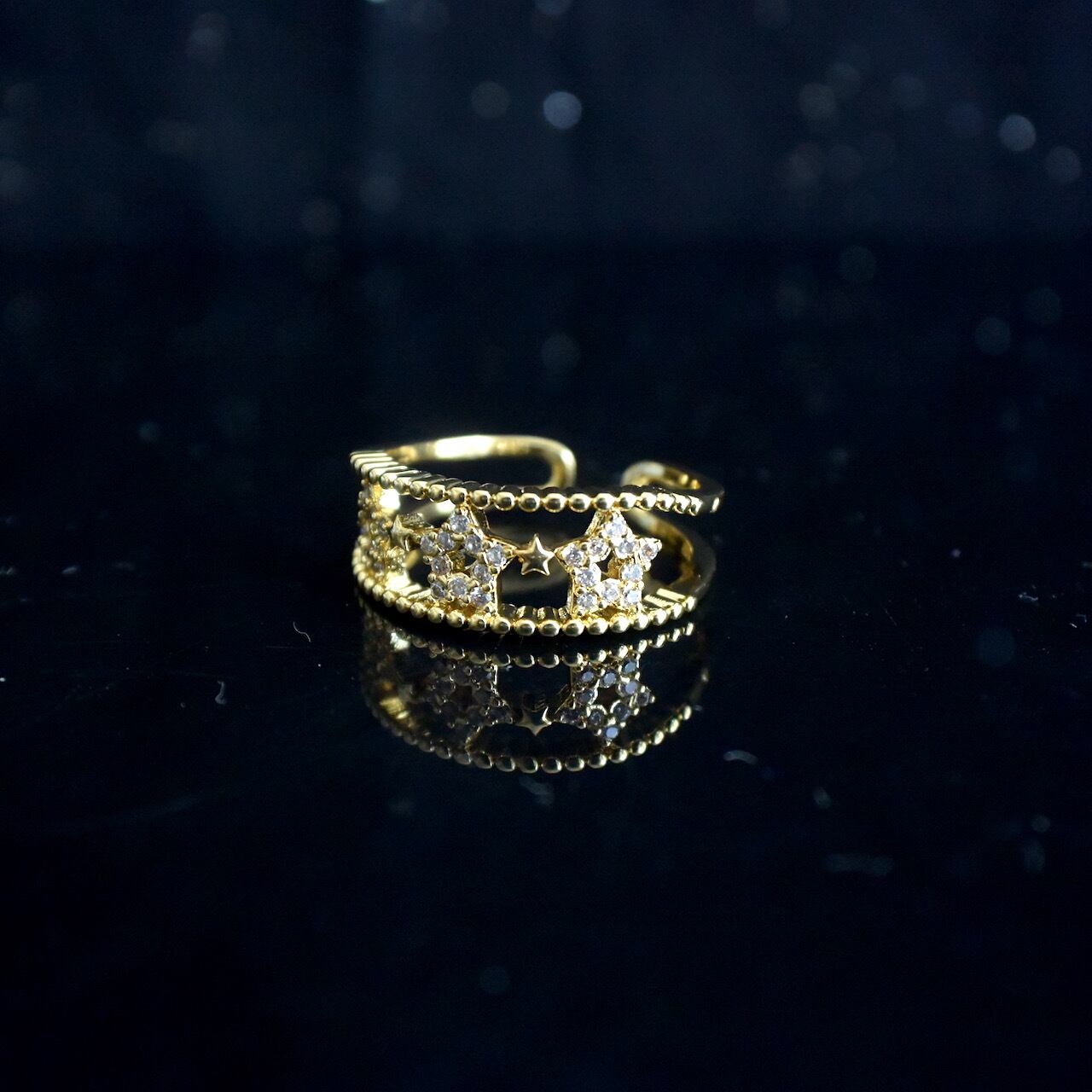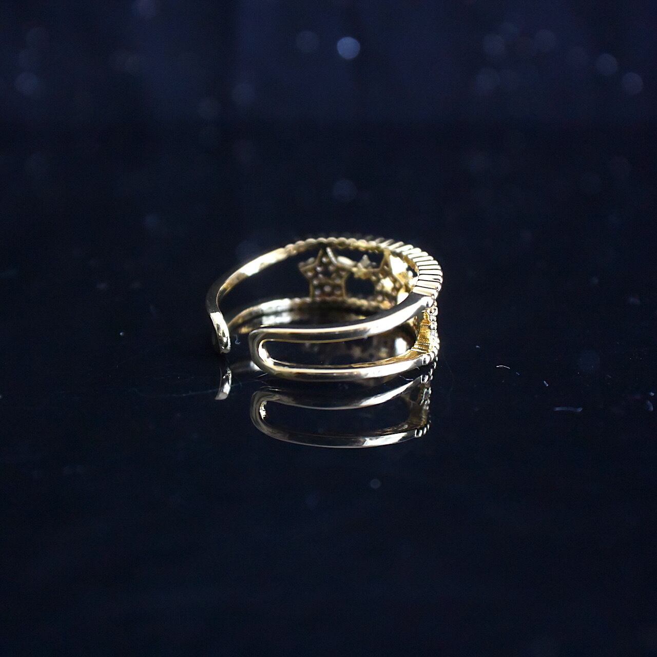 大きなジルコニアの三つ星オープンリング 調節可 ゴールド