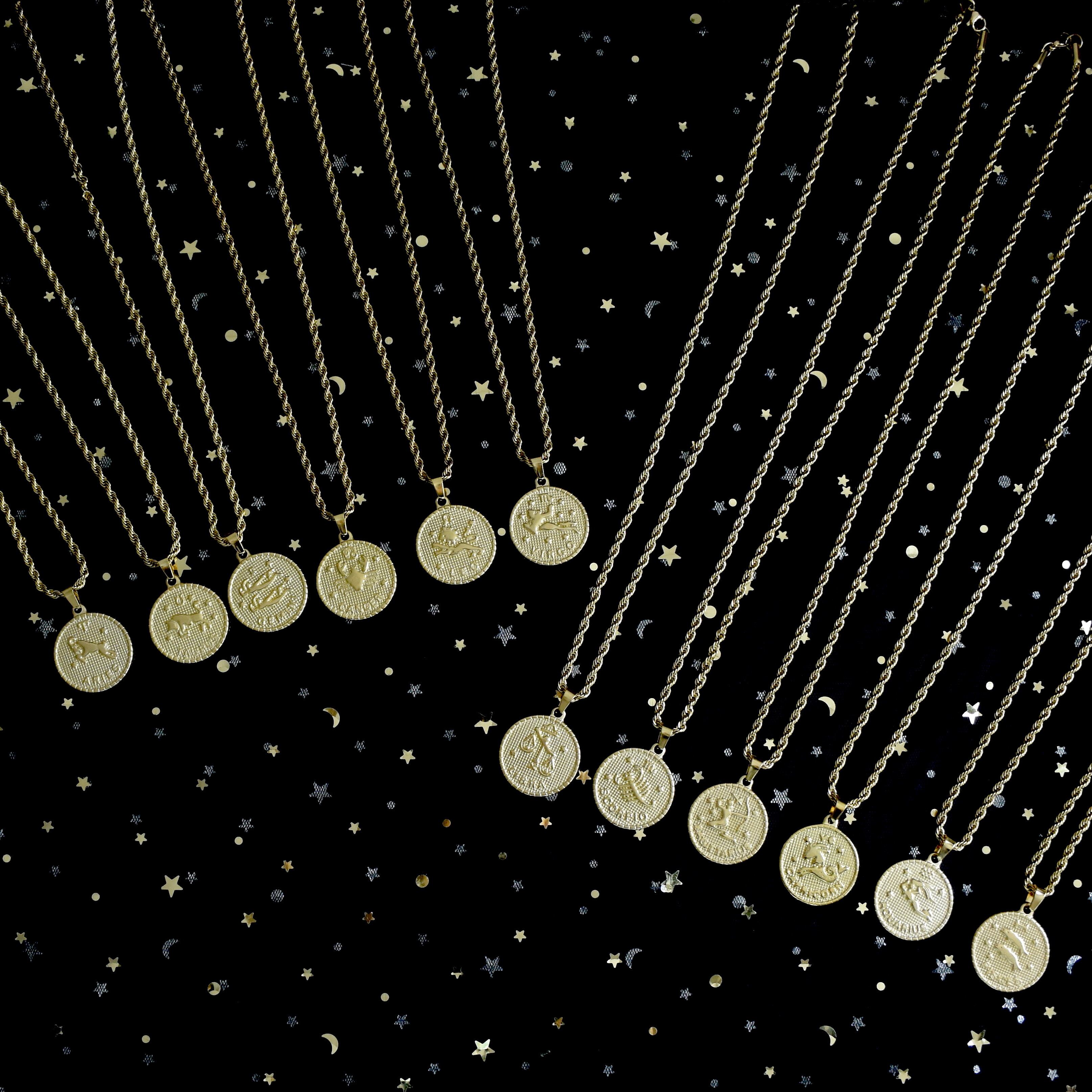 12星座のメダルチャーム付きマンテルチェーンネックレス ステンレスチェーン ゴールド