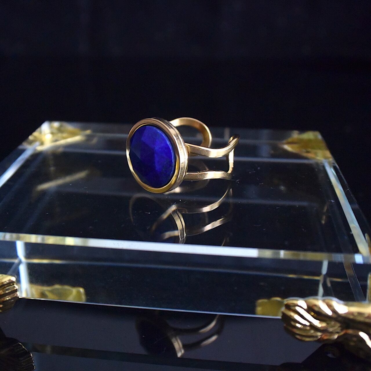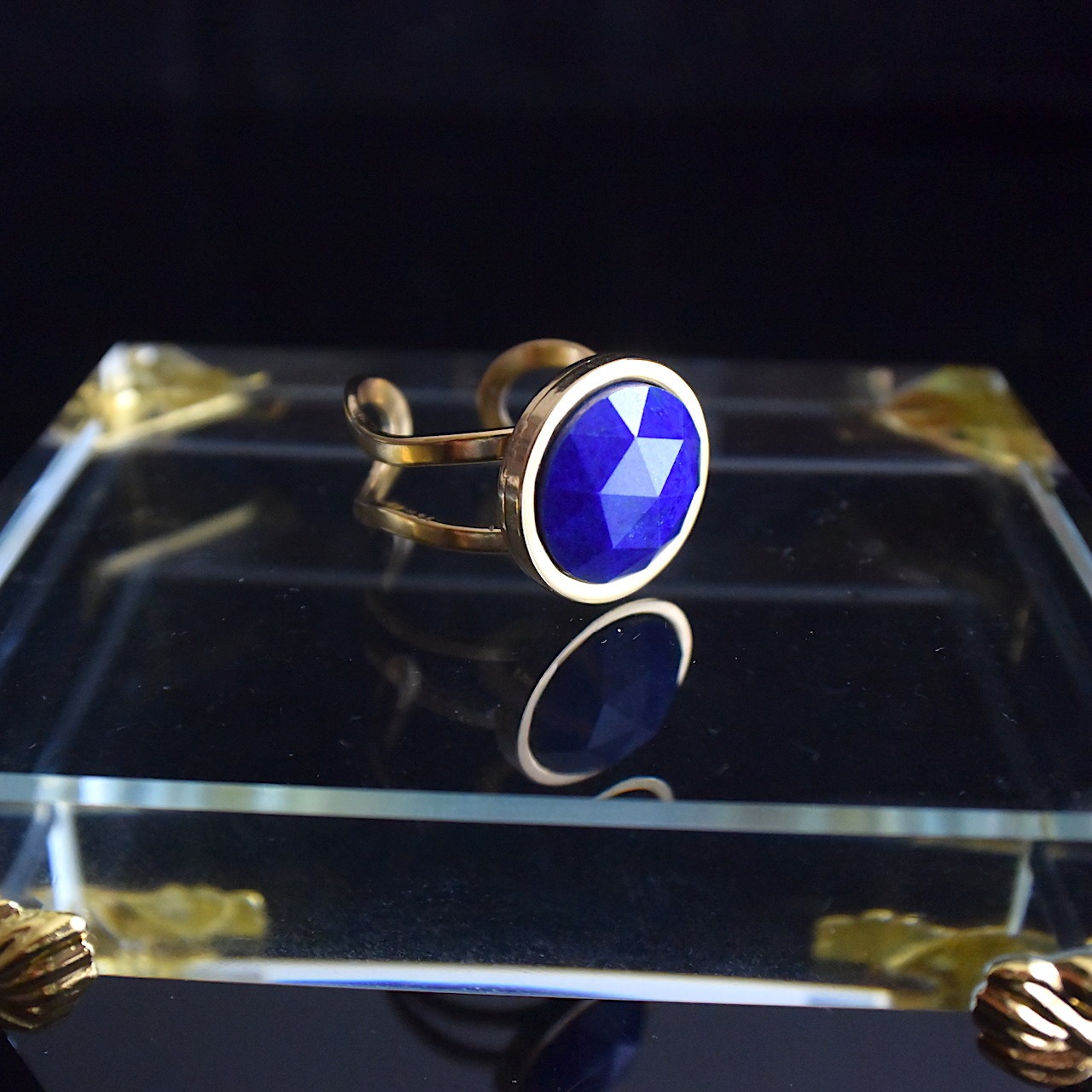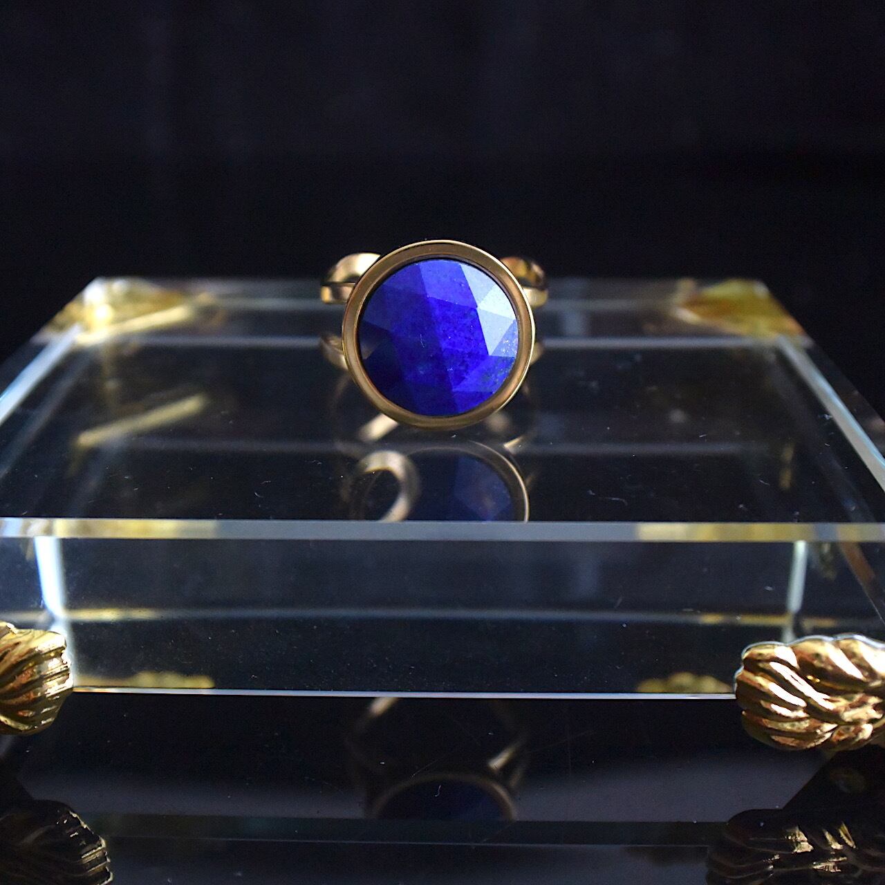 ラピスラズリの多面カットストーンのオープンリング 調節可能 ステンレス ゴールド