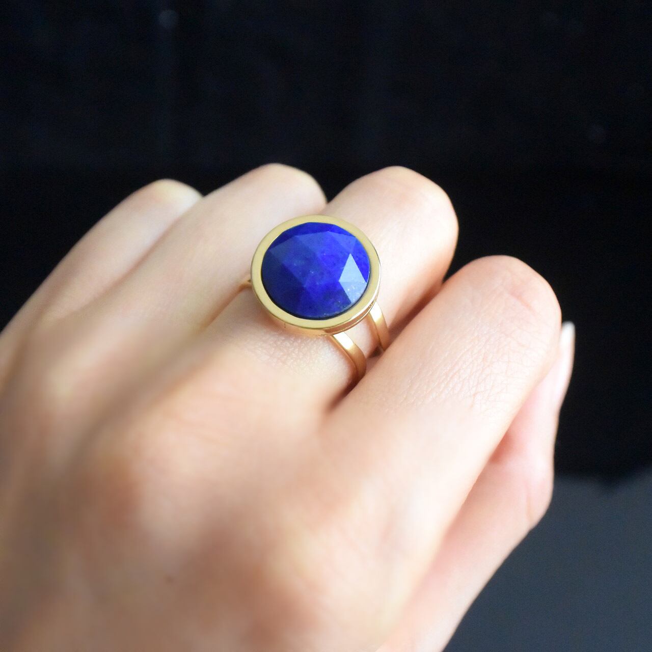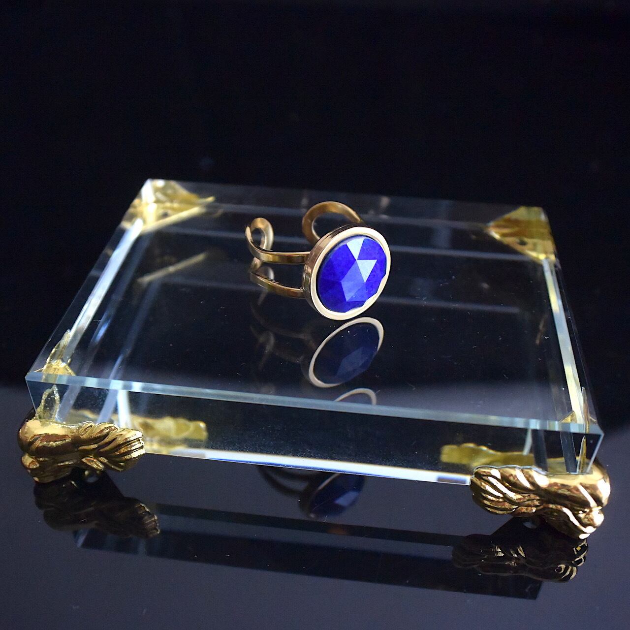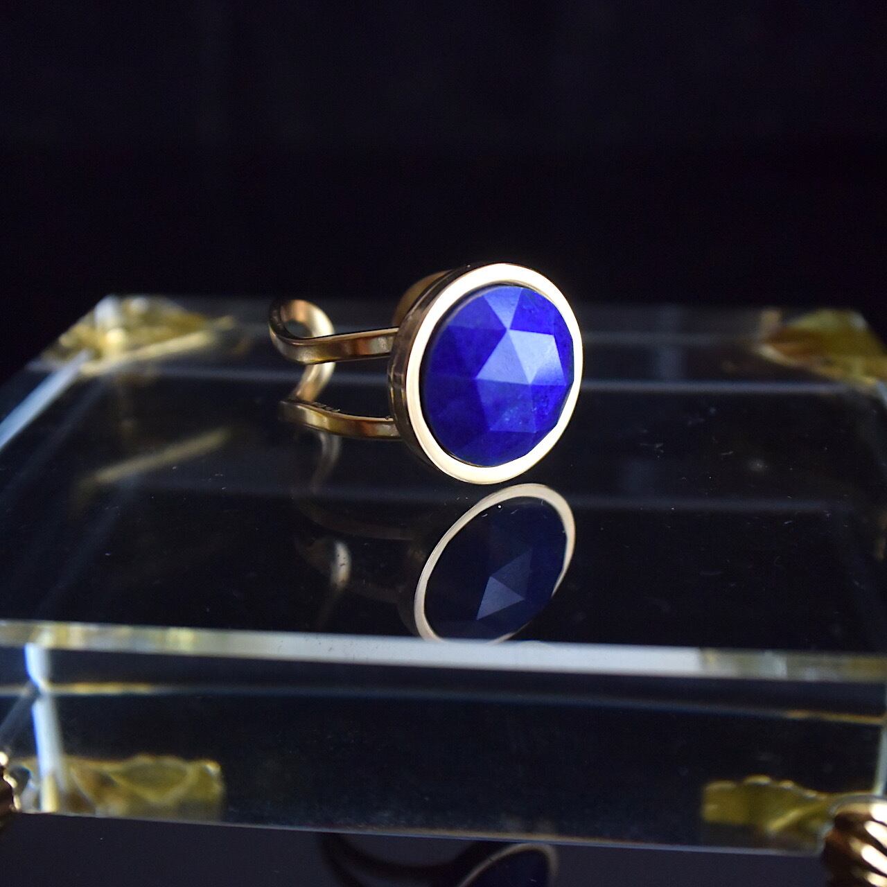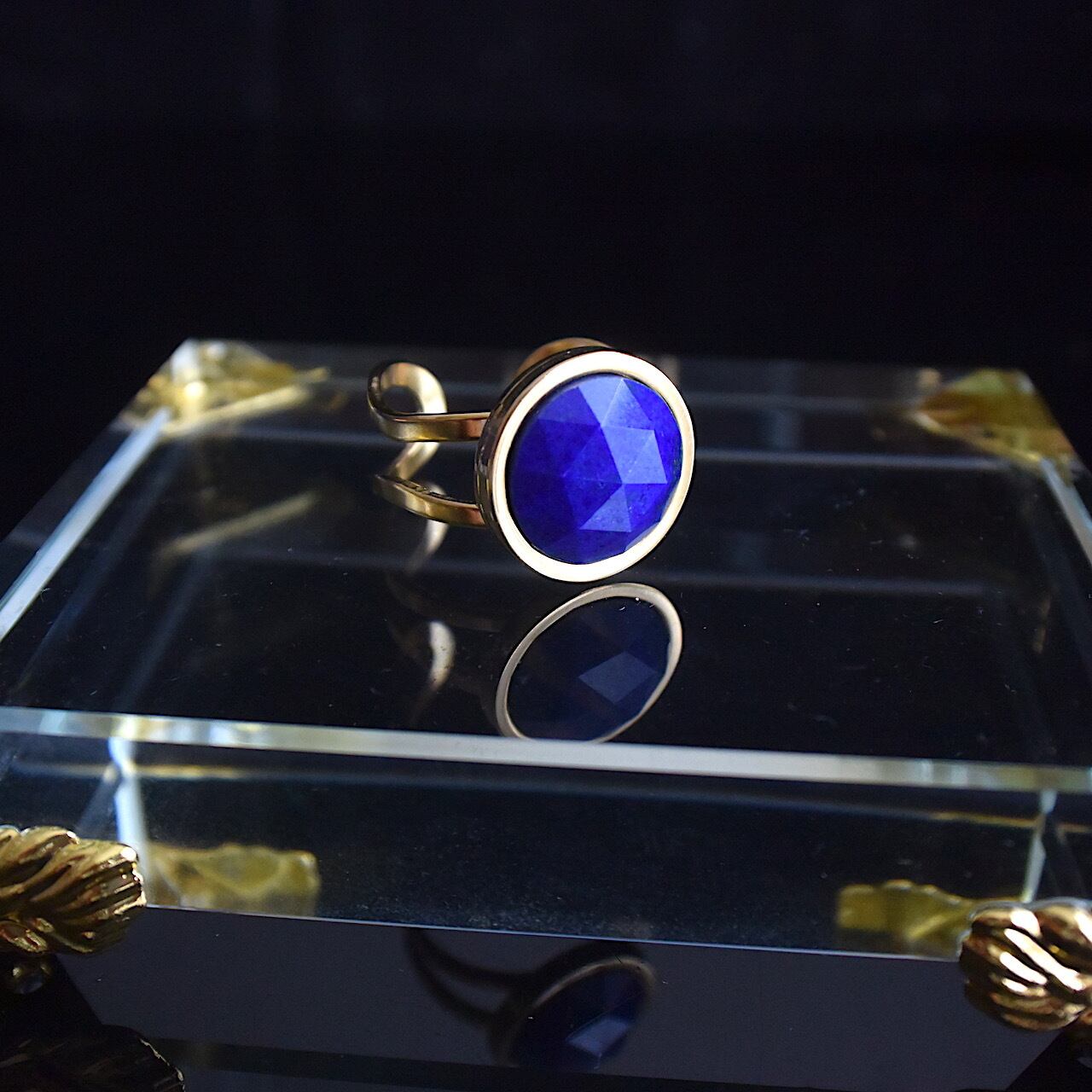 ラピスラズリの多面カットストーンのオープンリング 調節可能 ステンレス ゴールド