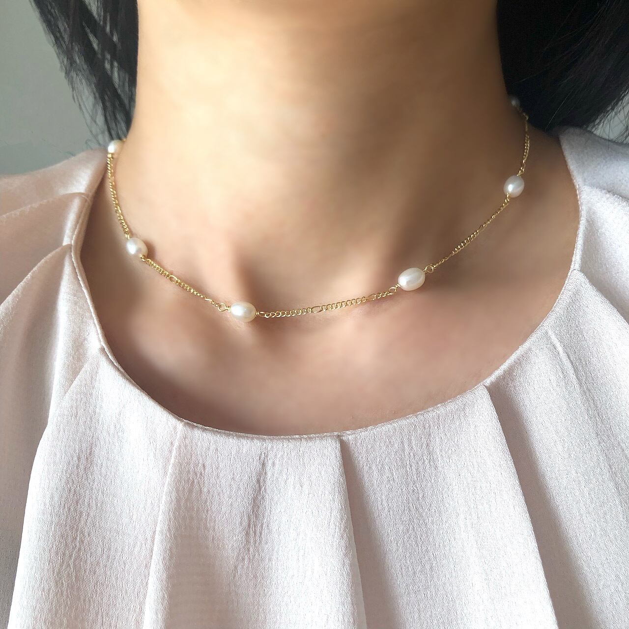 きれいなテリと大きめのポテト型の淡水パールが連なった、上品なステーションネックレスです。
